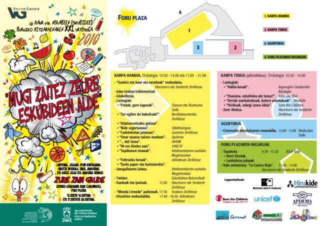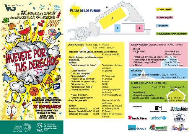 El sábado 20 de noviembre los txikis de la casa tendrán una cita en la capital alavesa. Con motivo del vigésimo primer aniversario de la Convención de los Derechos de la Infancia y Adolescencia, la céntrica Plaza de los Fueros se convertirá en un gran espacio lúdico festivo, donde niños y mayores disfrutarán de un sinfín de actividades.