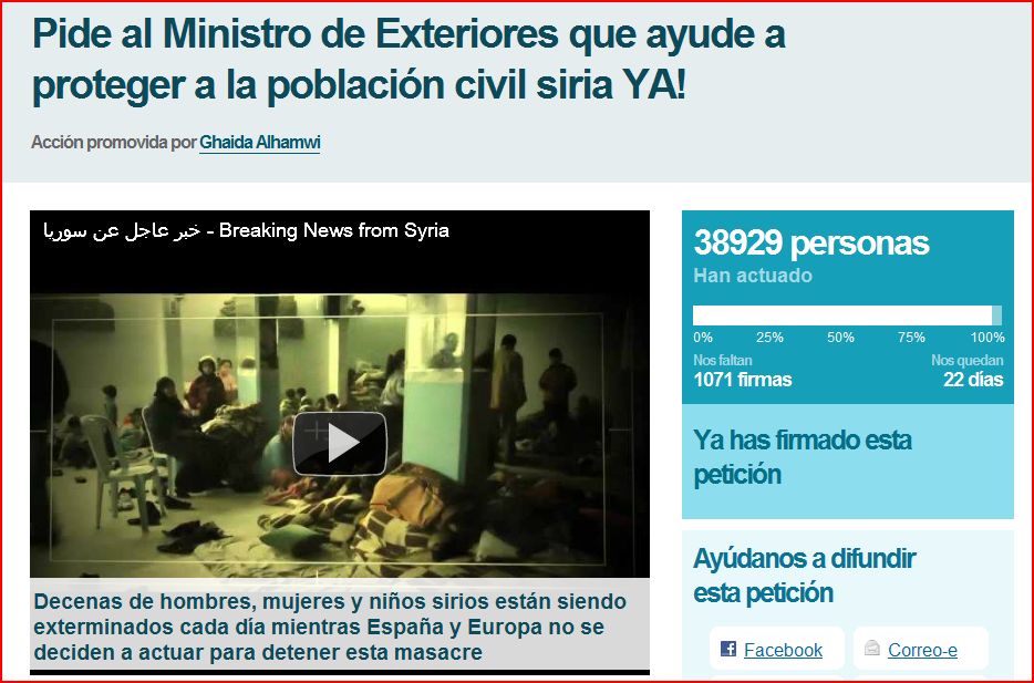 Por eso quiero pediros a vosotros, a todos los que cada día veis los cuerpos destrozados por la barbarie de mis compatriotas sirios y veis sus caras de desesperación pidiéndonos ayuda, pidiéndonos que no les abandonemos, que reclaméis a vuestros representantes en el exterior, el ministro García-Margallo y Catherine Ashton, que intercedan en todos los organismos internacionales para: