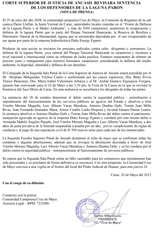 Adjuntamos la nota de la Comunidad Campesina ‘Cruz de Mayo’. Nuestro apoyo a los derechos de las mujeres y varones en su lucha por la VIDA.